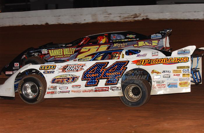 Billy Moyer races Clint Smith at the Golden Isles (GA) Speedway in February 2007 -