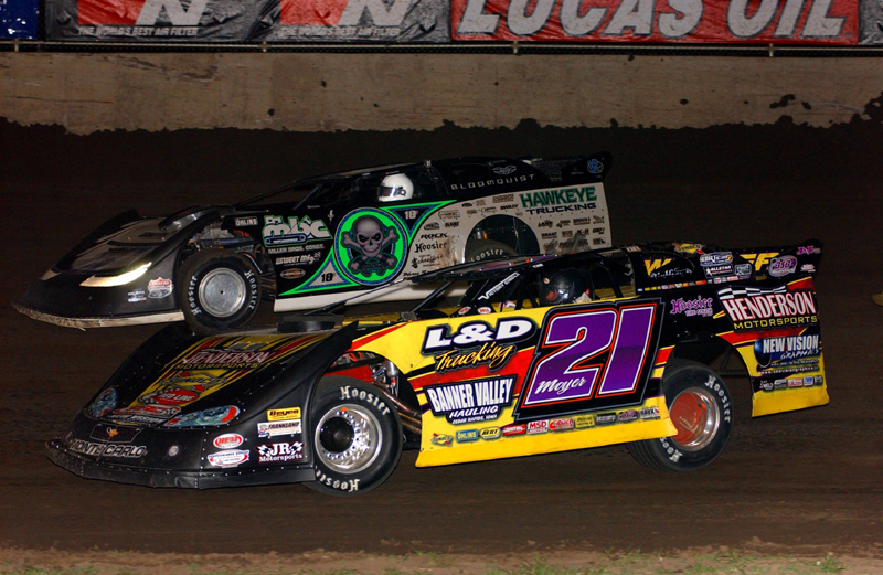 Billy battles Scott Bloomquist at the Tri-City (IL) Speedway on July 16, 2010 -